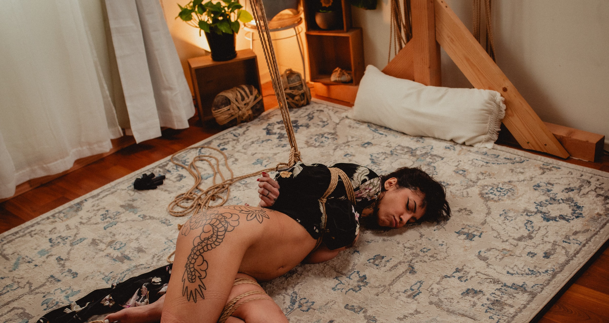 Kneeling and wearing a silky robe, Ravyn Alexa prepares to be expertly and artfully bound in rope by KnotSnacks. He caresses her, taking his time sensually with the rope on her skin, slowly exposing her tits. As the title of the scene implies, she is soon suspended, giggling, with one leg in the air, only her knee touching the ground. It looks sensual and comfy — but her breath deepens with exertion and his laughter turns more sadistic. He unties her as slowly as he tied her, groping her as he changes her position. Then he begins tying her bare feet up tight, before doing a little breath play, then teasing her inner thighs and sticking his gloved hand in her pussy. He tortures her feet before releasing her with a caring massage. A scene for rope geeks and those who simply love to gaze at a twisting, euphoric Ravyn!