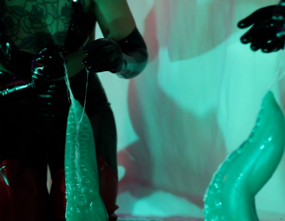 Ravyn AlexaDemon kneels in shiny latex in front of her mirror, her eyes and mouth strapped closed and bright red horns in a pointed crescent on her head. She opens the strap on her mouth to whispering sounds of latex squeaking and breath rasping, and sucks hungrily on her fingers, shoving them down her throat to...